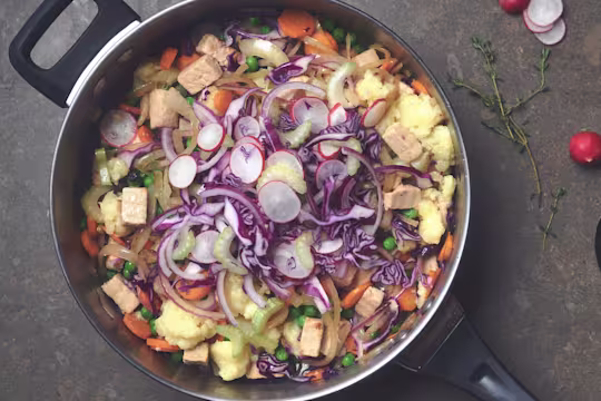 - Dans un wok ou une poêle, faire chauffer le reste d'huile et ajouter les carottes et l'oignon émincé et faire revenir pendant 5 minutes à feu vif. Réduire la température à feu moyen puis ajouter les dés de Quorn, les pois, le thym et la moitié du mélange de radis. Faire cuire pendant 3 minutes puis mélanger avec la purée de pommes de terre.