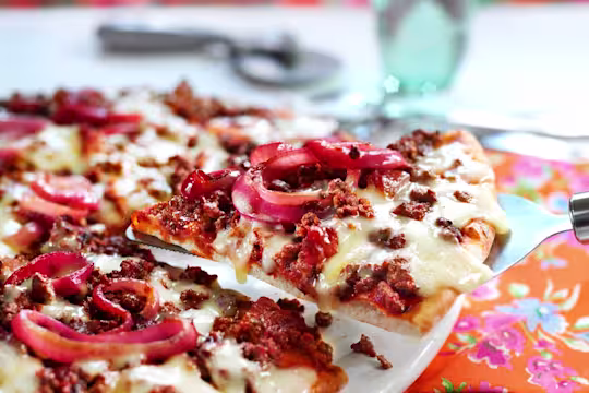 - Placer la pâte à pizza sur une plaque recouverte de papier cuisson, et ajouter la garniture. Saupoudrer d'origan séché et de fromage râpé. Mettre au four 10–15 minutes, jusqu'à ce que le fromage soit doré et forme des bulles.