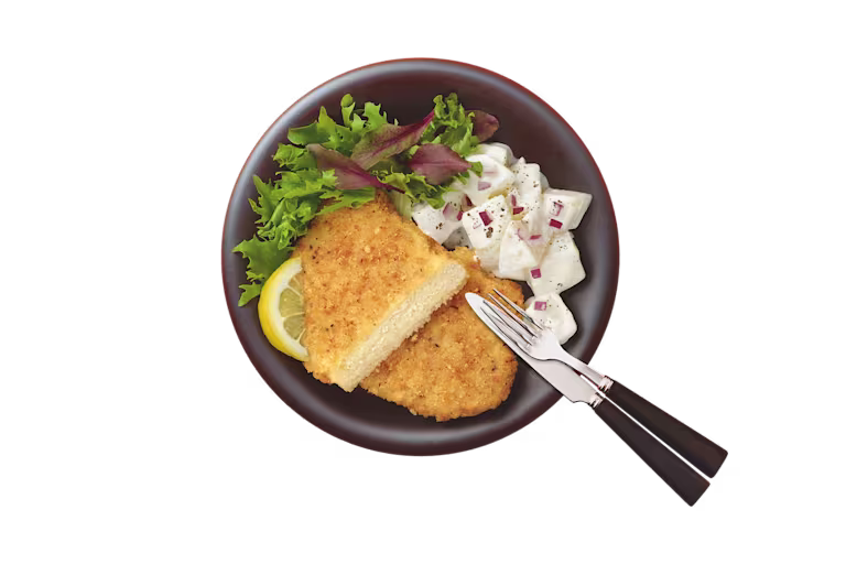 Escalope de Quorn 65% (produit Quorn à base de champignons 70% [OFSP N no. 100259], blanc d'oeuf [d'élevage en liberté], oignons, arôme, protéine de lait, amidon de tapioca, gélifiant: pectine), panure humide (eau, farine de proment, amidon de froment, farine de riz, sel de cuisine, huile végétale, acidifiant: acide citrique, arôme naturel d’agrumes), chapelure (farine de froment, poivre, levure, sel de cuisine), huile végétale.