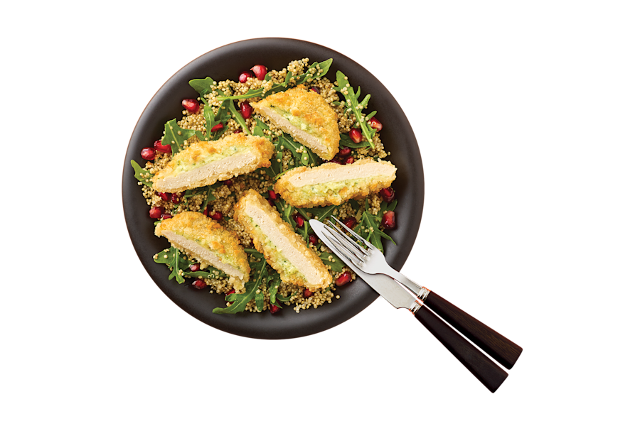 De savoureuses escalopes de Quorn à la mozzarella et au pesto recouvertes d'une panure croustillante.