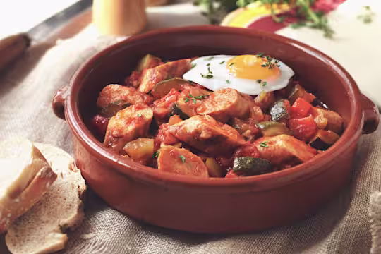 Servir les saucisses avec le pisto manchego et quelques tranches de pain croustillant à tremper dans la sauce. Vous pouvez même ajouter un œuf au plat, c'est compris dans le décompte des calories ! Profitez-en !