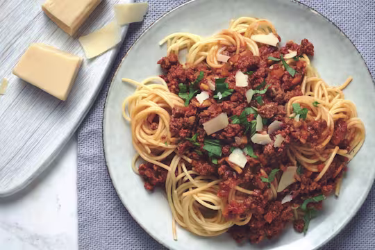 - Verser la sauce bolognaise de Quorn sur les spaghettis, rectifier l'assaisonnement et saupoudrer de fromage râpé.