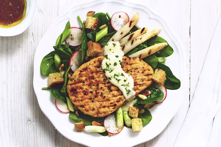 Salade de couscous avec steak de quorn au poivre à griller, légumes grillés et sauce au yoghourt